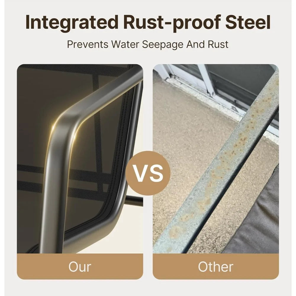 - Rust- and impact-resistant design: One-piece connected frame keeps the set sturdy and prevents rainwater seepage, while rounded armrests and table corners help minimize injuries.